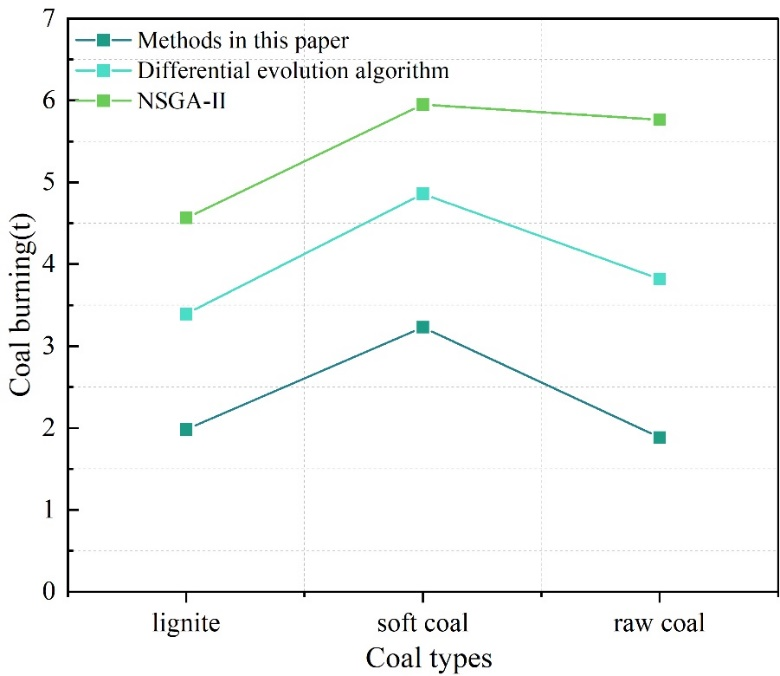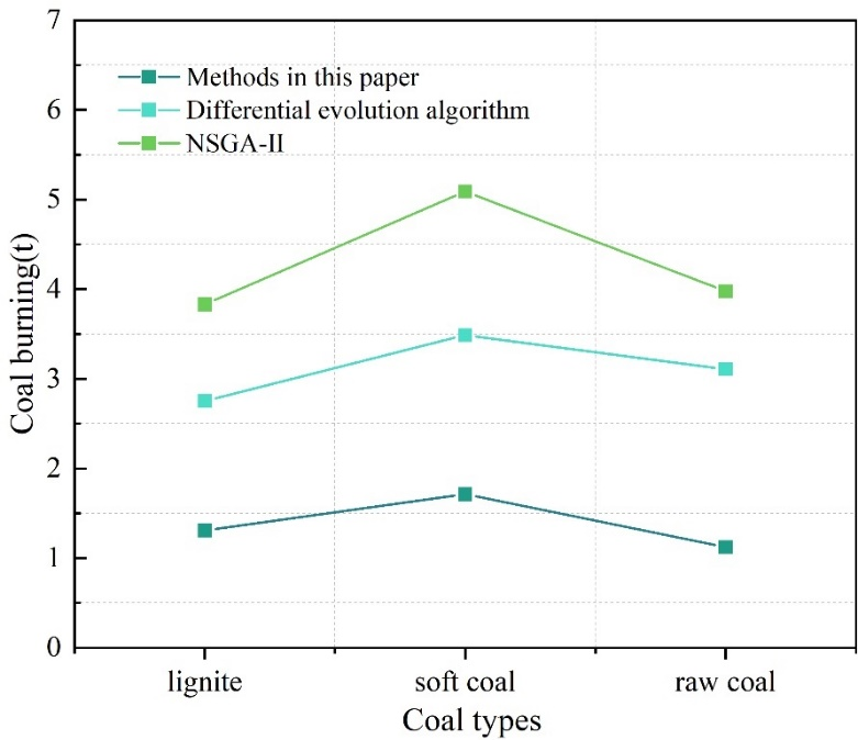 To verify the effectiveness of the method described in this paper in reducing energy consumption, the coal consumption required to produce CO\({}_{2}\) under hot start and cold start conditions was calculated separately for brown coal, bituminous coal, and raw coal. Each experiment was conducted five times, and the average value of the calculated results was obtained. By comparing the data, the ability of each algorithm to reduce energy consumption was determined. The experimental results for raw coal consumption under hot start and cold start conditions are shown in Figures 1 and 2, respectively. The results show that, when using the three types of coal, the industrial furnace’s CO\({}_{2}\) production capacity during cold start-up and hot start-up both achieve the lowest raw coal consumption using the method proposed in this paper. Therefore, the method proposed in this paper can effectively reduce energy consumption. As power plants demand lower raw material costs, the application effects of the differential evolution algorithm and NSGA-II method cannot achieve the optimal solution for reducing energy consumption, thereby proving the superior application effectiveness of the method proposed in this paper.