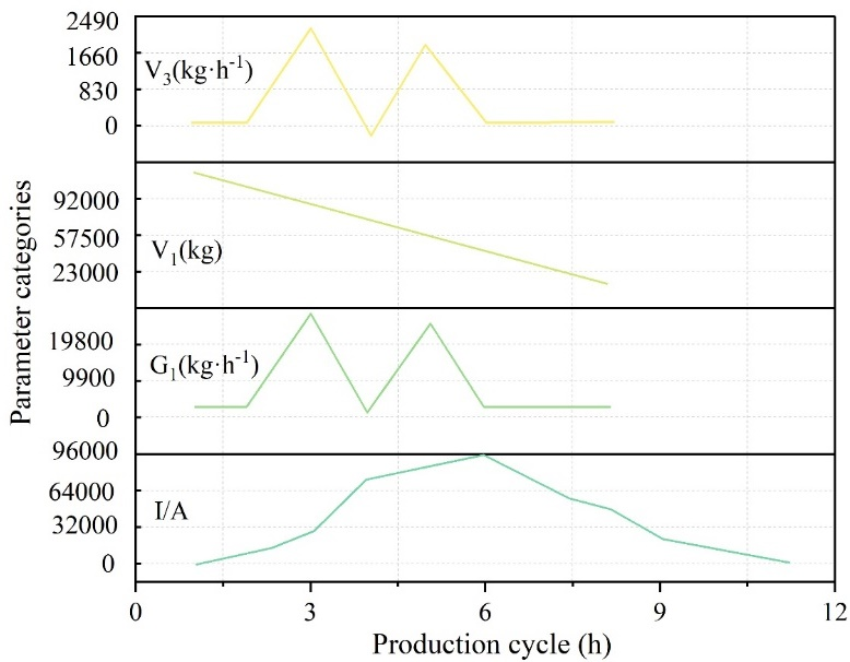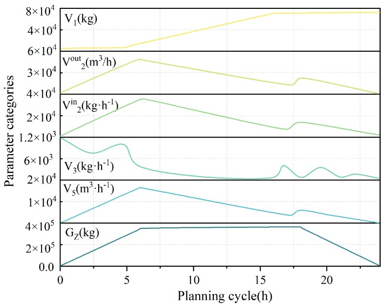 To verify the feasibility and rationality of the model, assume that the total input of raw materials is 400 tons of limestone, the production cycle is 23 hours, and the objective is to minimize fuel consumption. The mass of CO\({}_{2}\) gas in the gas holder is \(V_{1,t}\), CO\({}_{2}\) inlet flow rate to the lime kiln \(V_{2,1}^{in}\), CO\({}_{2}\) outlet flow rate from the lime kiln \(V_{2,1}^{out}\), CO\({}_{2}\) recovery rate \(V_{3,t}\), gas inlet flow rate to the heating furnace \(V_{4,t}\), and lime stone mass inside the furnace \(G_{z}\).