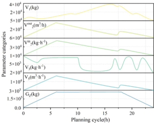 When the optimization objective is to minimize the recovery volume, the optimized overall scheduling plan results are shown in Figure 4. When the objective is to maximize CO\({}_{2}\) recovery, the gas mass in the gas holder is significantly reduced compared to the results in Figure 3, as this reduction is transferred to the CO\({}_{2}\) recovery process.