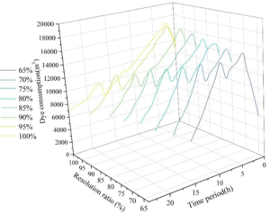 This section calculates the optimal production scheduling schemes obtained by the algorithm at target limestone decomposition rates of 65%, 70%, 75%, 80%, 85%, 90%, 95%, and 100%, and compares the differences in fuel consumption required at these decomposition rates. The system fuel allocation schemes under different decomposition rates are shown in Figure 5. The fuel input quantities corresponding to different decomposition rates are basically the same in the first six cycles. Starting from the seventh cycle, gradual differentiation begins to occur. The higher the decomposition rate, the longer the calcium carbonate remains in the furnace, resulting in a flatter decline in fuel consumption and higher overall energy consumption. When calcining 3.6\(\mathrm{\times}\)10\(^5\) kg of limestone, with a decomposition rate of 65%, the total production cycle is 5 hours, corresponding to a total fuel consumption of 14,593.77 m³ of gas, with a unit fuel consumption of 3,583.67 kJ/kg; When the decomposition rate is set to 100%, the total production cycle is 24 hours, corresponding to a total fuel consumption of 17,007.94 m\(^3\), with the unit fuel consumption increasing to 4,572.82 kJ/kg. As the limestone decomposition rate increases from 65% to 100%, the unit fuel consumption per product increases by 41.91 kJ/kg, 39.37%, 26.22 kJ/kg, 27.83 kJ/kg, 19.43 kJ/kg, and 28.34 kJ/kg for each 5% increase, with the overall trend of fuel consumption increase decreasing.
