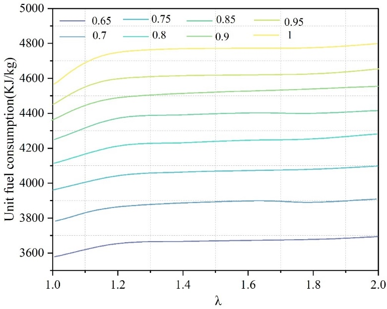 Based on the above analysis, the ratio of the total limestone feed rate to the rated capacity of the lime kiln is defined as \(\lambda\). A higher \(\lambda\) value indicates a greater extent to which the target calcium carbonate production exceeds the rated capacity of the kiln. The changes in fuel consumption per unit under different \(\lambda\) conditions are shown in Figure 6. It can be observed that, under the same decomposition rate, as \(\lambda\) gradually increases from 1 to 2, the unit fuel consumption per product of the system shows a slow increase. Further analysis reveals that, at a decomposition rate of 65%, when \(\lambda\) is 1, the system’s unit fuel consumption is 3,583.67 kJ/kg, and when \(\lambda\) is 2, the system’s unit fuel consumption increases to 3,696.41 kJ/kg, representing a growth rate of 3.15%. When \(\lambda\) is 1, if the decomposition rate is increased from 65% to 100%, the unit fuel consumption increases from 3,583.67 kJ/kg to 4,572.82 kJ/kg, with a growth rate of 27.6%. This indicates that, compared to \(\lambda\), the decomposition rate has a greater impact on operational energy consumption. Therefore, in actual production decision-making, companies should make comprehensive decisions based on their own needs, balancing product quality (decomposition rate) and operational energy consumption costs.