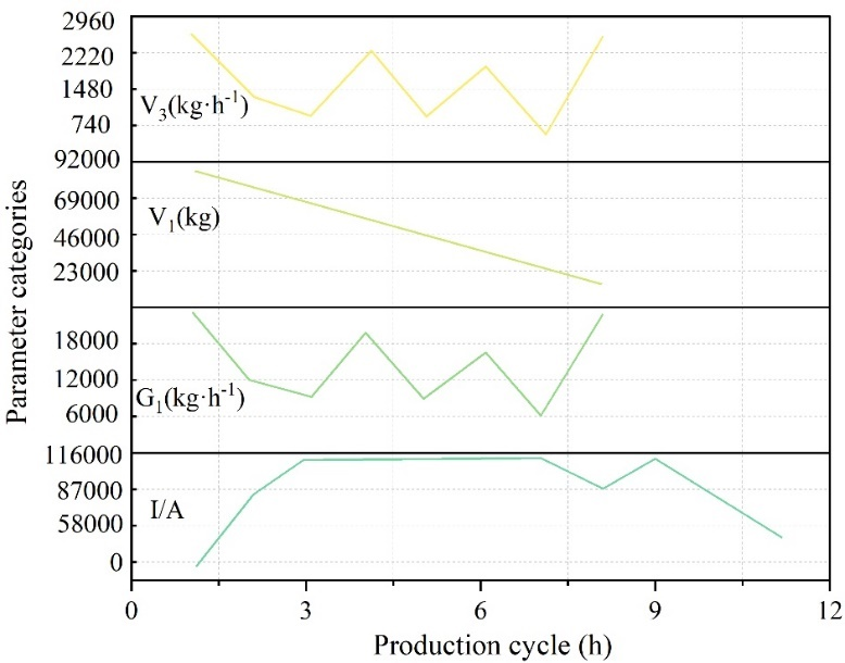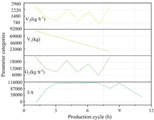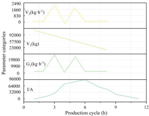 At the same time, for the production scheduling model of the mixed preheated pelletized ore hot blast stove, this chapter solves the model with maximum calcium carbide output as the objective. The overall system scheduling results with maximum output as the objective are shown in Figure 8. The scheduling scheme corresponding to the objective of maximizing production volume has an average feed rate in the first and second cycles that far exceeds that of the production scheme targeting minimum unit power consumption. When considering all production cycles, its average feed rate is also greater than the latter. Therefore, its power supply reaches a peak in the third cycle and remains at a high level thereafter, only decreasing after the end of feed supply in the eighth cycle. Therefore, in actual production, enterprises should pay attention to the balance between unit electricity consumption and calcium carbide production when formulating production plans. It is recommended to use multi-objective optimization methods to address this issue.