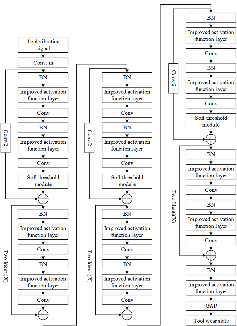 This paper focuses on tool wear monitoring in precision machining of CNC machine tools. Based on the key technologies described above, an improved residual contraction network structure is designed, as shown in Figure 1. The preprocessed tool vibration monitoring signals are used as input, and multiple improved residual contraction modules are used for feature extraction. Finally, after passing through the GAP layer, the monitoring results of the tool wear status are output.