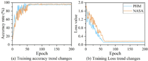 As shown in the figure, on the PHM and NASA datasets, the model becomes more stable as the number of iterations increases, with significant fluctuations in loss and accuracy during the first 25 iterations. Specifically, when the model reaches approximately 60 epochs, the monitoring accuracy for tool wear on both datasets stabilizes above 95%. For the loss function, the model converged after 60–65 iterations, achieving loss function values of 0.12 and 0.17 on the PHM and NASA datasets, respectively. Compared to previous studies, the accuracy of the proposed model is approximately 3%–10% higher than that of traditional models, and its training and prediction performance outperforms most reported models, demonstrating the feasibility and superiority of the proposed model.