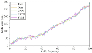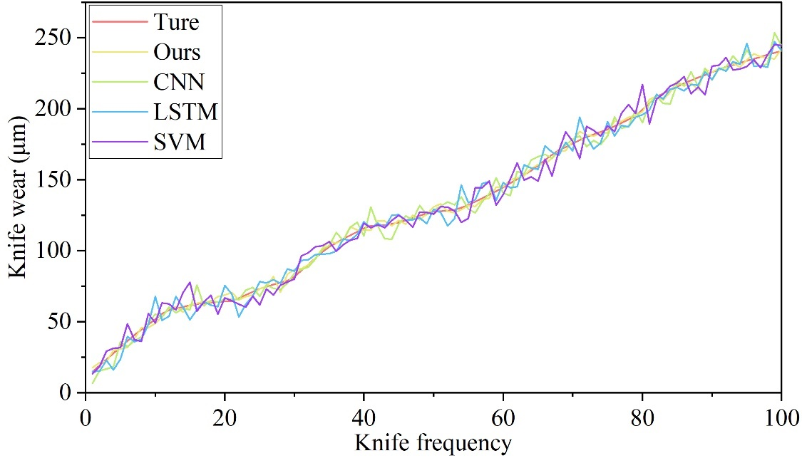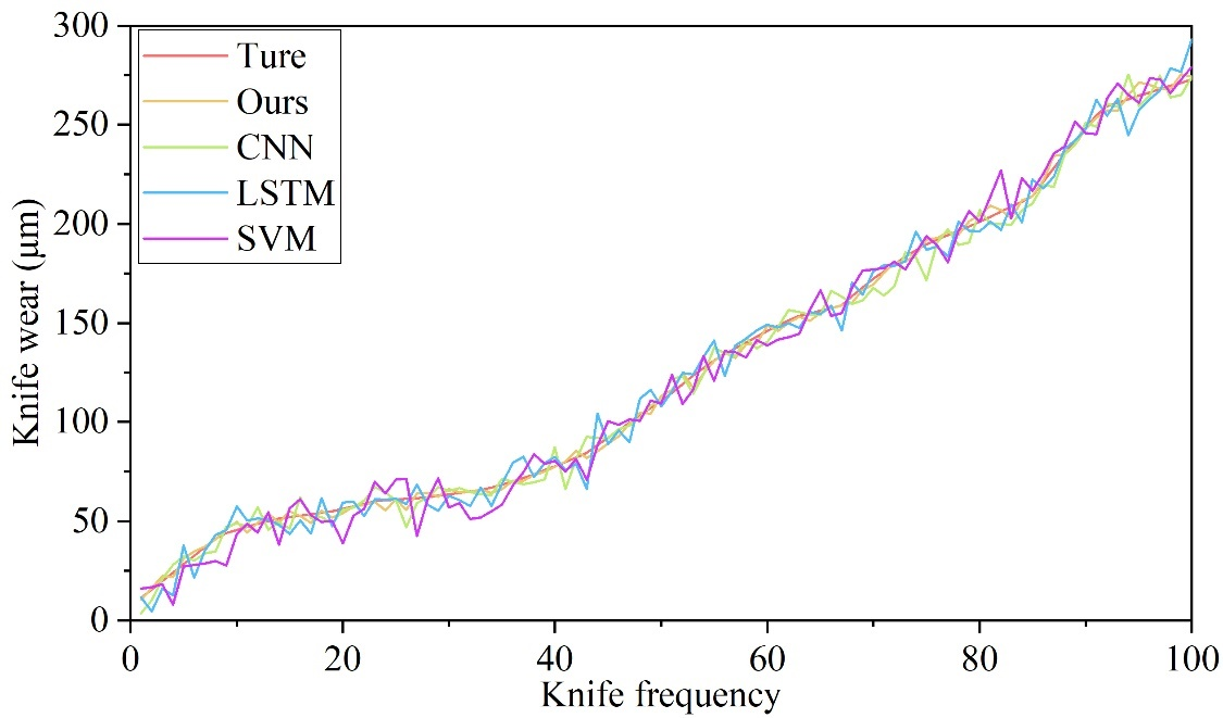In order to quantitatively compare the performance of the model in this paper with that of traditional models on different datasets, the root mean square error (RMSE), mean absolute error (MAE), and coefficient of determination (\(R^{2}\)) of the monitored tool wear values and actual tool wear were calculated. The calculation methods for these three indicators are as follows: \[\label{GrindEQ__8_} RMSE=\sqrt{\frac{1}{N} \sum _{i=1}^{N}(p_{i} -y_{i} )^{2} } , \tag{8}\] \[\label{GrindEQ__9_} MAE=\frac{1}{N} \sum _{i=1}^{N}|p_{i} -y_{i} | , \tag{9}\] \[\label{GrindEQ__10_} R^{2} =1-\frac{\sum _{i}(p_{i} -y_{i} )^{2} }{\sum _{i}(\overline{y_{i} }-y_{i} )^{2} } . \tag{10}\]