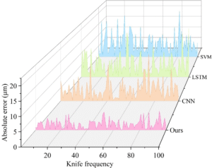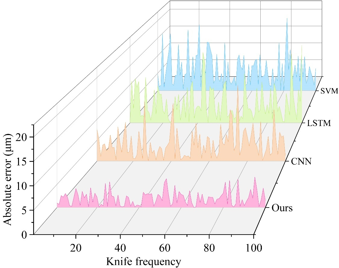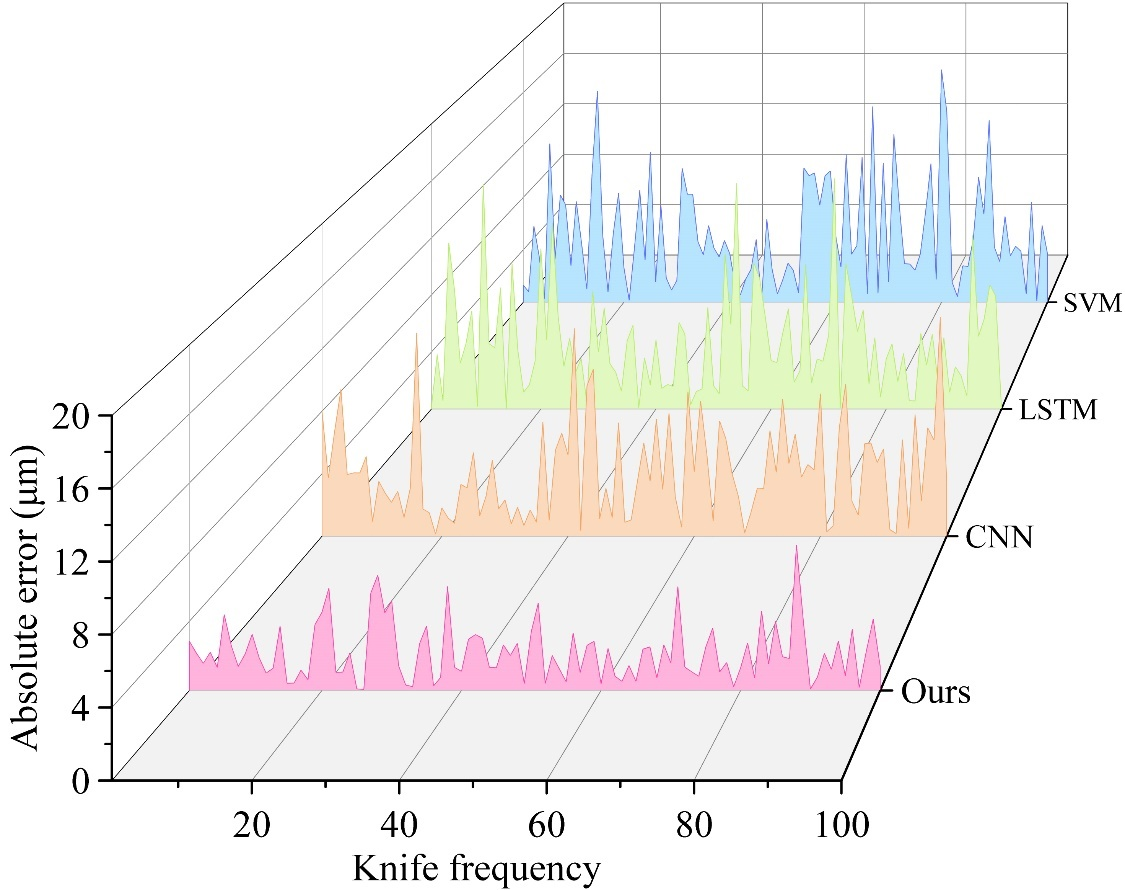 To validate the effectiveness of the tool wear monitoring model proposed in this paper, we tested and analyzed the performance of the model by comparing the prediction accuracy of four different models in the task of online monitoring and early warning of tool wear in CNC machine tools. Figures 4 and 5 show the monitoring results of rear face wear for different models on the PHM and NASA datasets, respectively. As can be seen from the figures, the prediction curves of these methods generally show an upward trend, consistent with the characteristic of tool wear accumulating over time. However, compared with the method proposed in this paper, the other methods exhibit significant fluctuations. Additionally, Figures 6 and 7 show the absolute identification errors of different models in detecting rear tool face wear on the PHM and NASA datasets, respectively. Statistically, the absolute error in identifying tool wear throughout the entire wear period for the proposed model ranges from 0 to 8.5 \(\mu\)m, while the identification error for the comparison models can reach up to 20.7 \(\mu\)m. When tool wear reaches a certain threshold, cutting force and cutting temperature increase sharply, accelerating the rate of tool wear and increasing the difficulty of identification. The proposed model demonstrates high sensitivity in identifying tool wear throughout the entire wear period, thereby validating the superiority of the proposed method.