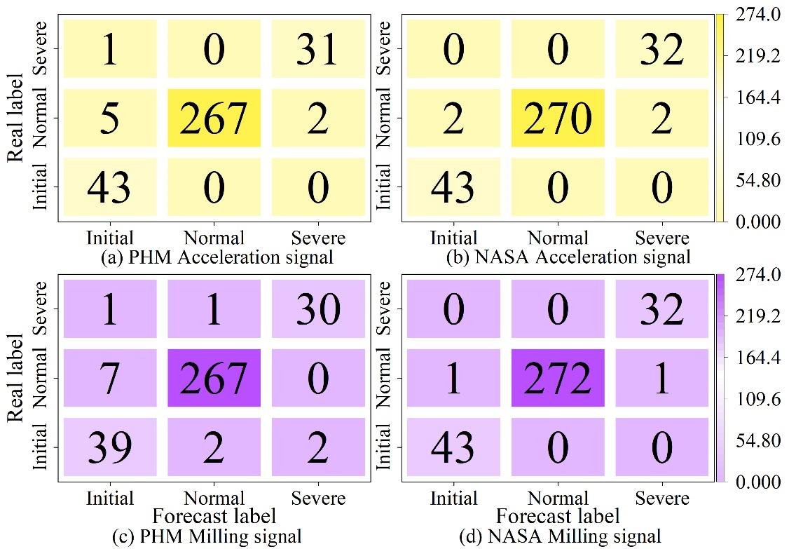 The confusion matrix is used to visually evaluate the model’s recognition results for imbalanced data categories. Figure 8 shows the tool wear state recognition results after different sensing signals are input into the model. Among them, Figures 8 (a) and (b) show the results based on acceleration signals, while Figures 8 (c) and (d) show the results based on milling force signals. It is worth noting that the model structures for both signal inputs are identical, thereby avoiding the issue of model retraining caused by sensor replacement in actual machining environments. As shown in the figure, both signals demonstrate excellent performance in identifying the severe wear stage, validating the model’s generalization capability across different sensory signals. Specifically, in Figure 8(d), the recall rate and accuracy for the severe wear stage exceed 95%, achieving very good results. The identification results based on cutting force signals are more accurate, as cutting force is more sensitive to tool wear. Notably, the number of samples incorrectly identified as the severe wear stage from other categories is nearly zero, which avoids downtime losses caused by misjudging the tool change timing in actual engineering applications. Additionally, in the recognition results based on acceleration signals, the number of samples incorrectly identified as the severe wear stage from the initial wear stage is zero, effectively avoiding downtime losses caused by monitoring errors during new tool milling.