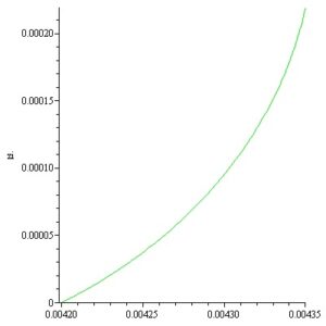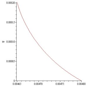 In this way by computation the inner and outer surfaces meridian curves of a convex static Si meniscus is obtained for \(p_i = 35\,[\text{Pa}]\) and \(p_e = [\text{Pa}]\) respectively. The meridian curves \(z_i(r)\) and \(z_e(r)\) with the variation of the angles \(\alpha_i, \alpha_e\) are represented on the next Figures 15-18: