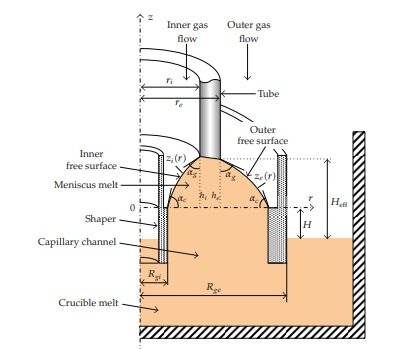 At the beginning is important to note is that in case of tube the meniscus has two free surfaces one inner free surface and one outer free surface. The free surfaces of the static meniscus, in single crystal growth by EFG method, in hydrostatic approximation are described by the Young-Laplace capillary equation [21]: \[\begin{aligned} \label{eq2.1}\begin{cases} \gamma\!\left(\frac{1}{R_{1i}}+\frac{1}{R_{2i}}\right)=&P_{ai}-P_{mi}, \\ \gamma\!\left(\frac{1}{R_{1e}}+\frac{1}{R_{2e}}\right)=&P_{ae}-P_{me}, \end{cases} \end{aligned} \tag{1}\] here, \(\gamma\) is the melt surface tension; \(\frac{1}{R_{1i}},\frac{1}{R_{2i}}\) denote the main normal curvatures of the meridian arc of the inner free surface and \(\frac{1}{R_{1e}},\frac{1}{R_{2e}}\) denote the main normal curvatures of the meridian arc of the outer free surface; \(P_{ai}\) and \(P_{ae}\) is the pressure above the inner and the outer free surface respectively, equal to the pressure of the gas flow introduced in the tube and in the furnace respectively [21], denoted by \(p_{gi}\) \(\left(P_{ai}=p_{gi}\right)\) and \(p_{ge}\) \(\left(P_{ae}=p_{ge}\right)\). The pressures \(P_{mi}\) and \(P_{me}\) under the inner and the outer free surface respectively are equal to \(-\rho g\,(z_i+H)\) and \(-\rho g\,(z_e+H)\) respectively (the direction of \(Oz\) is upwards, see Figures 9 and 10). \(\rho\) denotes the density of the melt and \(g\) the gravity acceleration; \(H\) denotes the height difference between the top of the shapers and the melt level in crucible\(\,\)—\(\,\)the distance between the shapers top level and the crucible melt level. \(H\) is positive when the crucible melt level is under the shapers top level and it is negative when the shapers top level is under the crucible melt level (see Figures 9 and 10). The meridian curve of the inner free surface of meniscus is denoted by \(z_i(r)\) and that of the outer free surface is denoted by \(z_e(r)\) (see Figures 9 and 10).