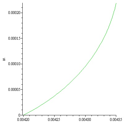 In this way by computation the inner and outer surfaces meridian curves of a convex static Si meniscus is obtained for \(p_i = 35\,[\text{Pa}]\) and \(p_e = [\text{Pa}]\) respectively. The meridian curves \(z_i(r)\) and \(z_e(r)\) with the variation of the angles \(\alpha_i, \alpha_e\) are represented on the next Figures 15-18: