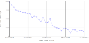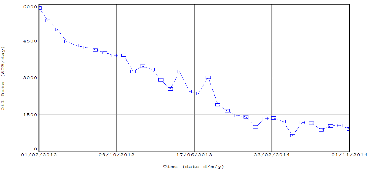 A pronounced production drop is observed in mid-2012 in Figure 1, marked by a sharp deviation from the preceding decline pattern. Such an abrupt decrease is indicative of temporary operational effects rather than reservoir depletion, as natural decline alone would not typically produce a sudden rate reduction of this magnitude.