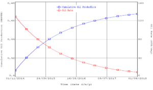 The estimated economic lifetime is governed by technical parameters such as the initial forecast oil rate (128.896 STB/day), the exponential decline rate, and the assumed economic limit. The simulation results demonstrate that the well remains capable of sustained production over several years; however, the oil production rate progressively decreases and approaches 9.834 STB/day by June 2018, which is close to commonly adopted lower thresholds for economic operation. With a remaining recoverable volume of 0.060523 MMSTB over the forecast interval, the results indicate that the well still retains production potential, although the magnitude of additional recovery is relatively small compared to earlier stages of production.