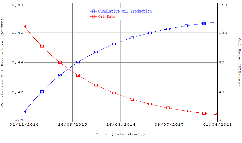 At the beginning of the forecast period on 1 November 2014, cumulative oil production was 0.406709 MMSTB and increased steadily to 0.467232 MMSTB by 1 June 2018. This behavior is consistent with an exponential decline profile, in which cumulative oil production continues to grow over time while the contribution of additional production per unit time decreases as reservoir energy declines.