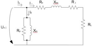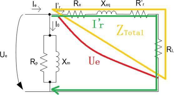 Serial impedance association \[Z_{Total}=\sqrt{\left(R_e+R_r^{\prime}+R_L\right)^2+\left(X_{eq}\right)^2}.\]