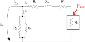Total mechanical power of the machine \[P_{mec} =3\left[R_r^{\prime}\left(\frac{1}{s}-1\right)\right] \left( \frac{U_e}{\sqrt{\left(R_e+R_r^{\prime}+R_L\right)^2+\left(X_{eq}\right)^2}} \right)^2.\]